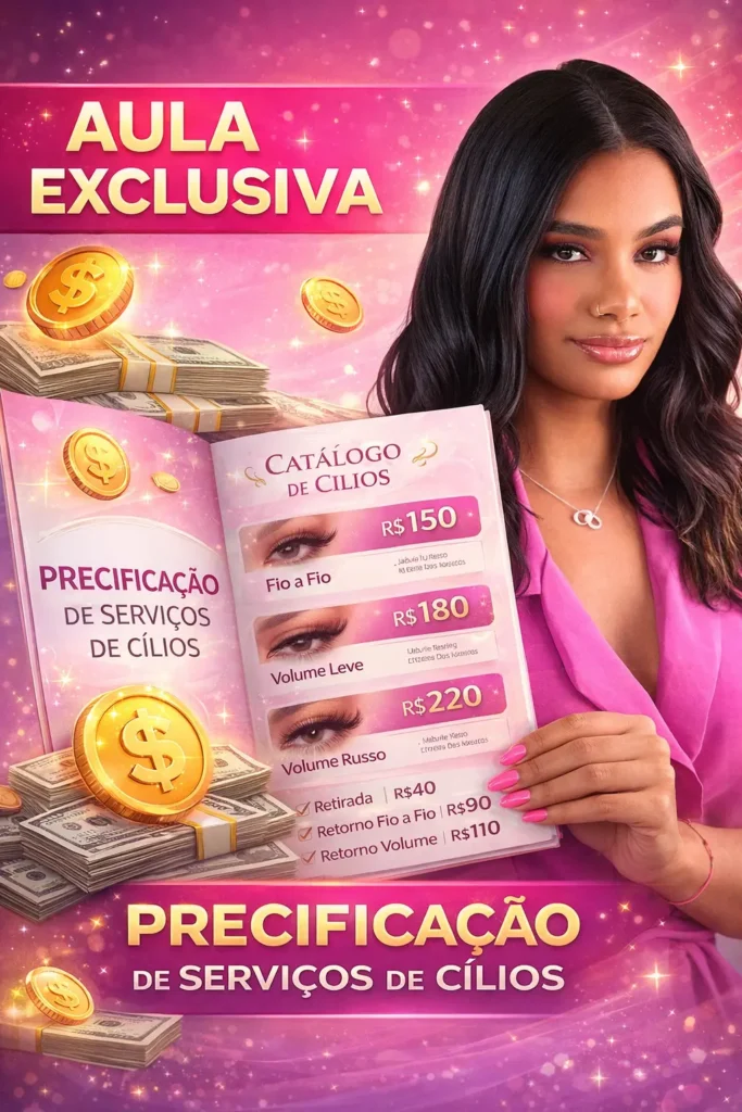 Guia prático para aprender a precificar seus serviços de cílios com segurança: quanto cobrar, como justificar seus valores e como parar de desvalorizar seu trabalho. Tudo explicado de forma simples, direta e aplicável à sua realidade.