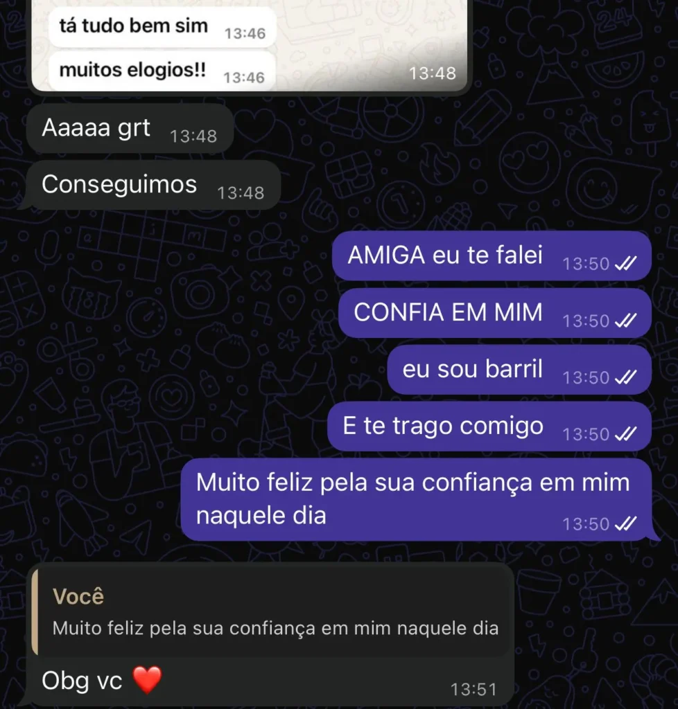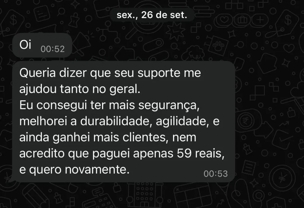 Se nos primeiros 7 dias você sentir que o suporte não é pra você, pede reembolso total. Sem perguntas. Sem complicação.